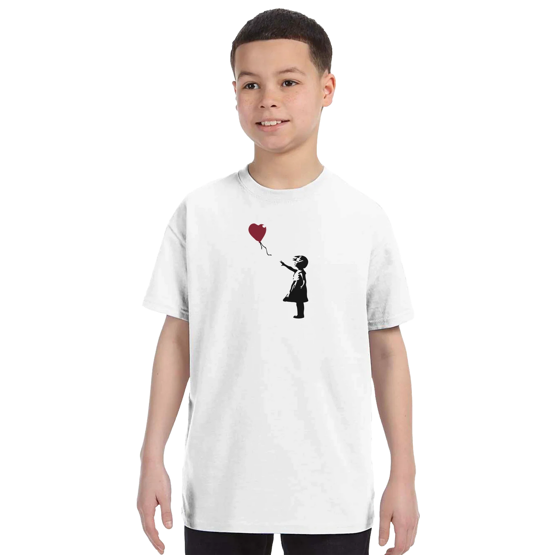 This tee has a famous artwork originally created by the mysterious artist Banksy. It shows a young girl with her hand extended toward a red heart-shaped balloon carried away by the wind. The first work was on Waterloo Bridge, and other murals were around London, though none remain there. Banksy has several times used variants of this design to support social campaigns.