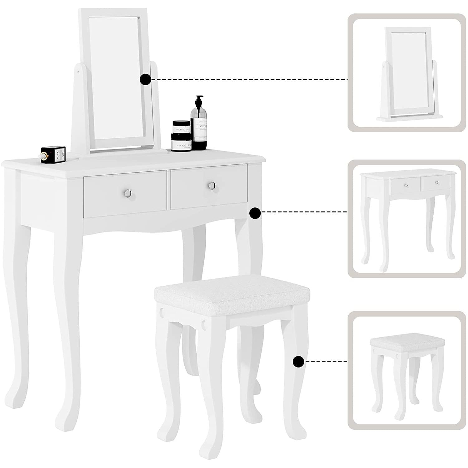 Designed to fit any bedroom or dressing area, this vanity table set pairs a sturdy table, a plush cushioned stool, and smart storage to keep your essentials within reach and your surface tidy.