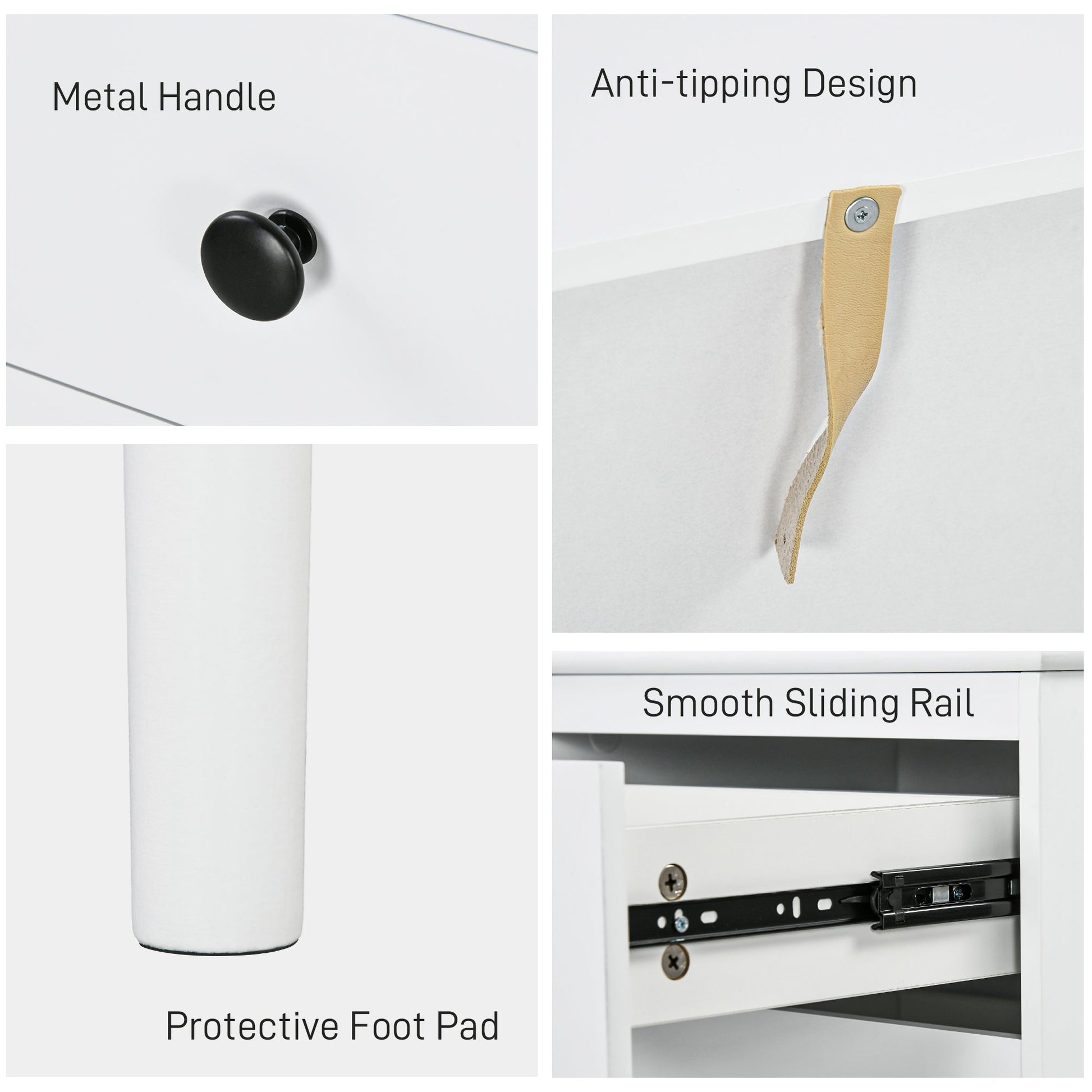 - Three drawers and a flat tabletop offer plenty of storage. Metal runners for smooth opening/closing