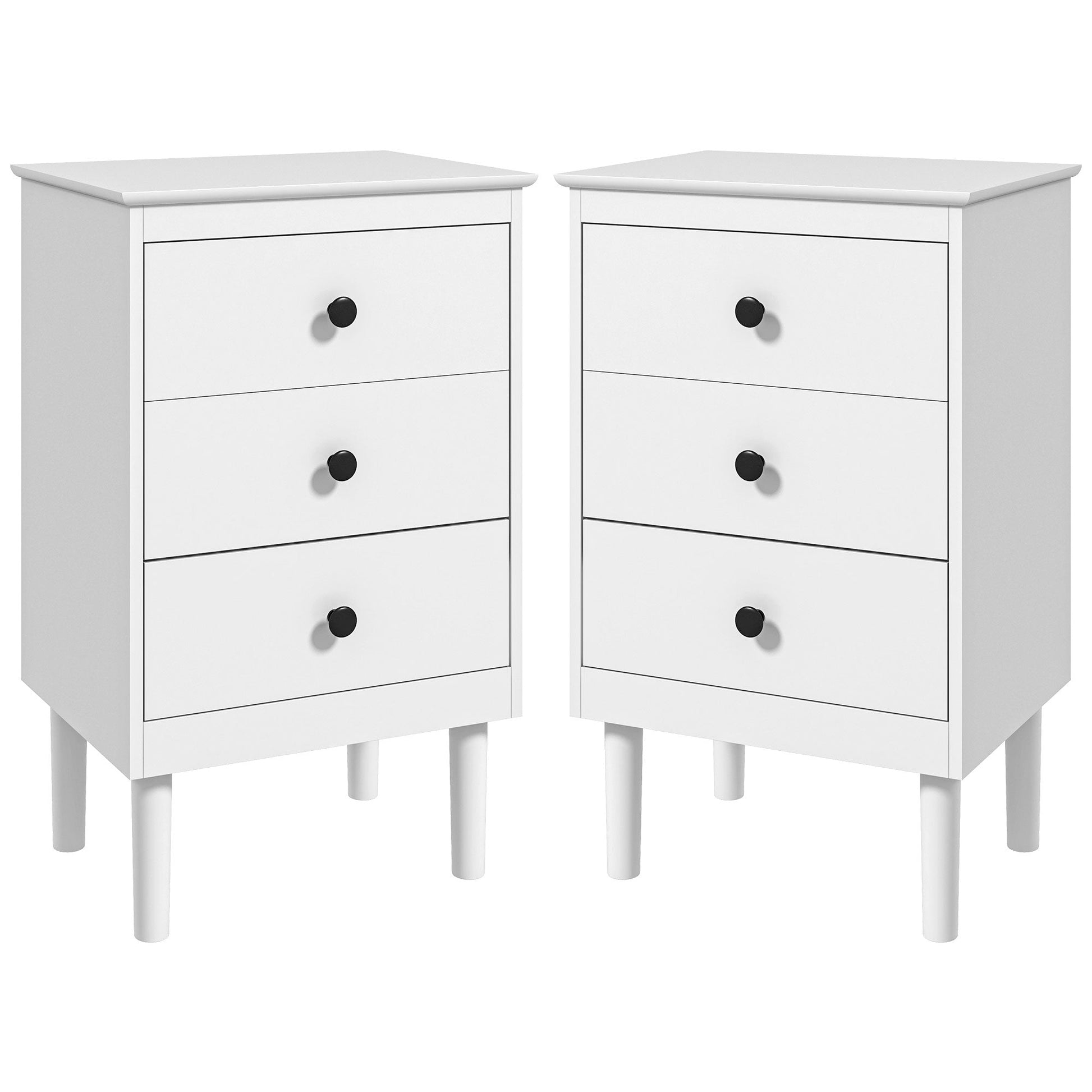 Simple style for all homes, offering plenty of nighttime space: say hello to these two bedside tables. In a clean white boxy design, they are super easy to welcome into your home interior style; the black handles add a touch of striking contrast. Three drawers offer handy holding room, with a flat tabletop to make space for essentials like an alarm clock. Made from particle board, each nightstand is reliable, with anti-tipping straps to securely fix to the wall.